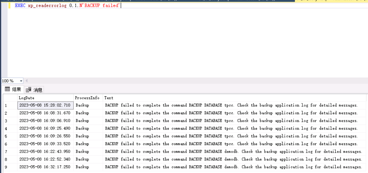 實際上還可以通過xp_readerrorlog來讀取errlog更加快速得篩選出備份失敗的記錄,但本次沒有再測試,有興趣的朋友可以自行參考測試。