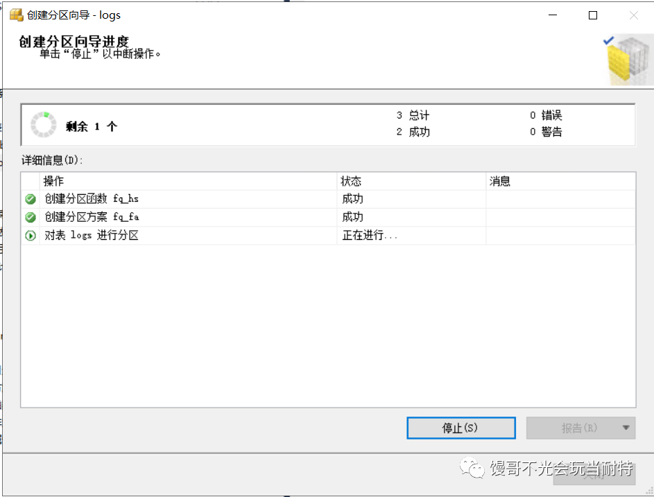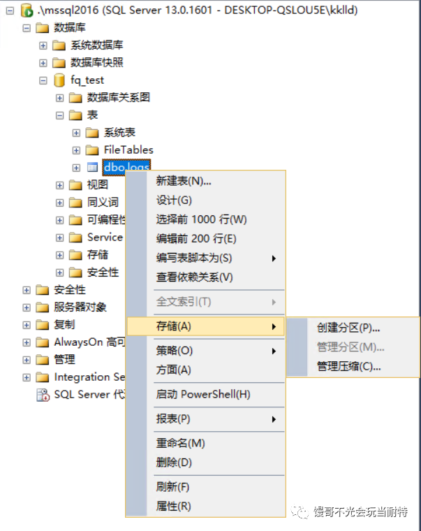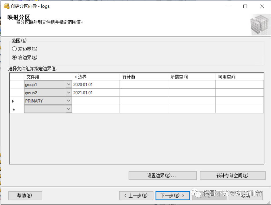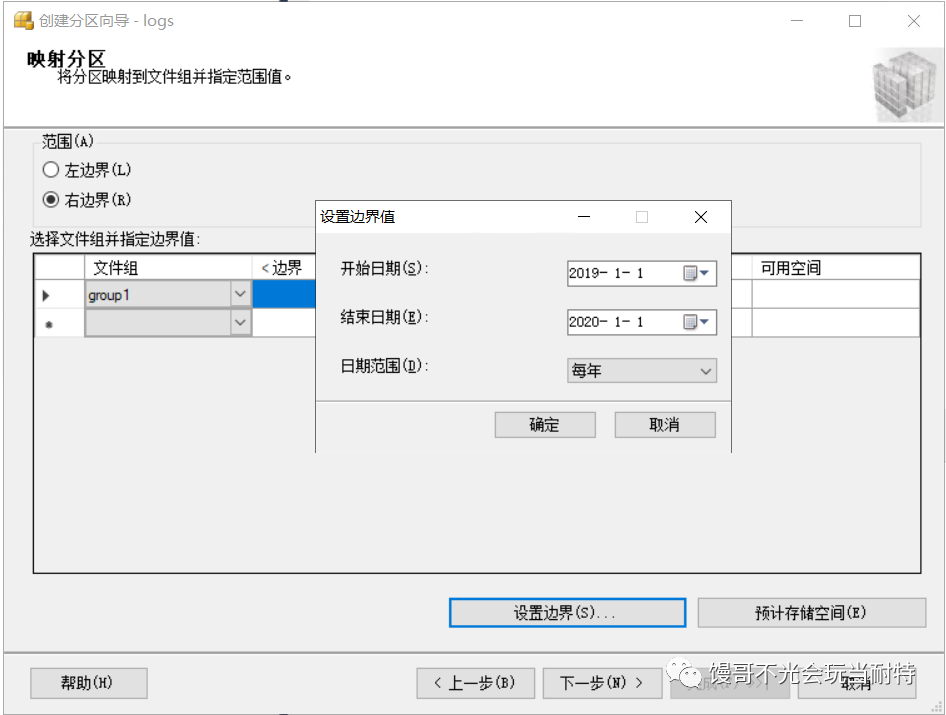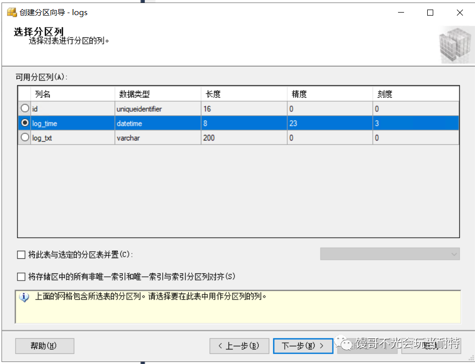 選中l(wèi)ogs表=>存儲(chǔ)=>創(chuàng)建分區(qū),啟動(dòng)分區(qū)向?qū)Чぞ摺?/p>