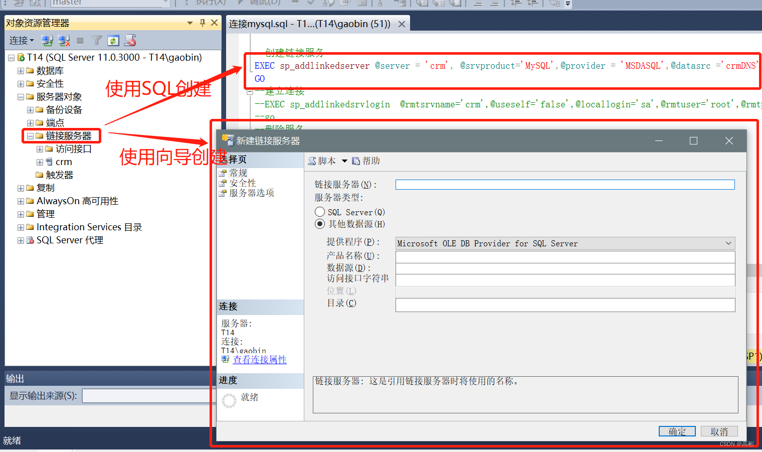 --創建鏈接服務器EXEC sp_addlinkedserver @server = "crm", @srvproduct="MySQL",@provider = "MSDASQL",@datasrc ="crmDNS" --刪除鏈接服務器execute sys.sp_dropserver @server="crm"