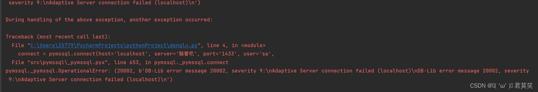 import pymssql connect = pymssql.connect(host="localhost",server="LAPTOP-40O6HVDS", port="1433",user="yunmengze", password= "123456", database="soft2104") # host不要改其參數,server改成你的服務器名, port不要改其參數,user你的用戶名, password你的密碼, database你的數據庫名if connect: