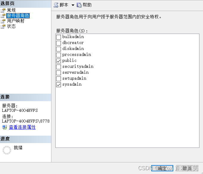 找到你的登錄名(我的是yunmengze),雙擊服務器角色,將服務器角色的sysadmin選中:
