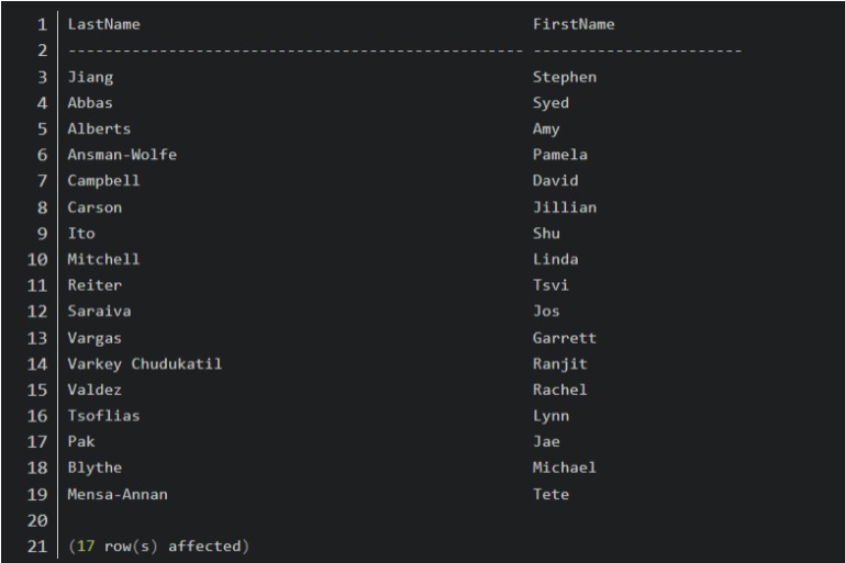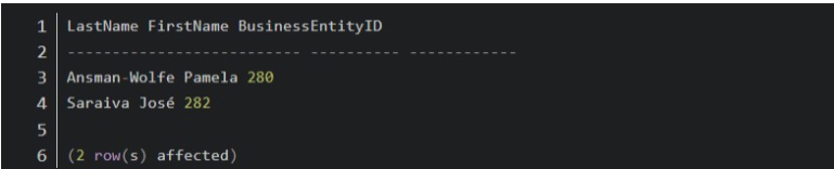 USE AdventureWorks2016;GOSELECT LastName, FirstNameFROM Person.Person cINNER JOIN HumanResources.Employee eON c.BusinessEntityID = e.BusinessEntityIDJOIN Sales.SalesPerson sON e.BusinessEntityID = s.BusinessEntityID;GO