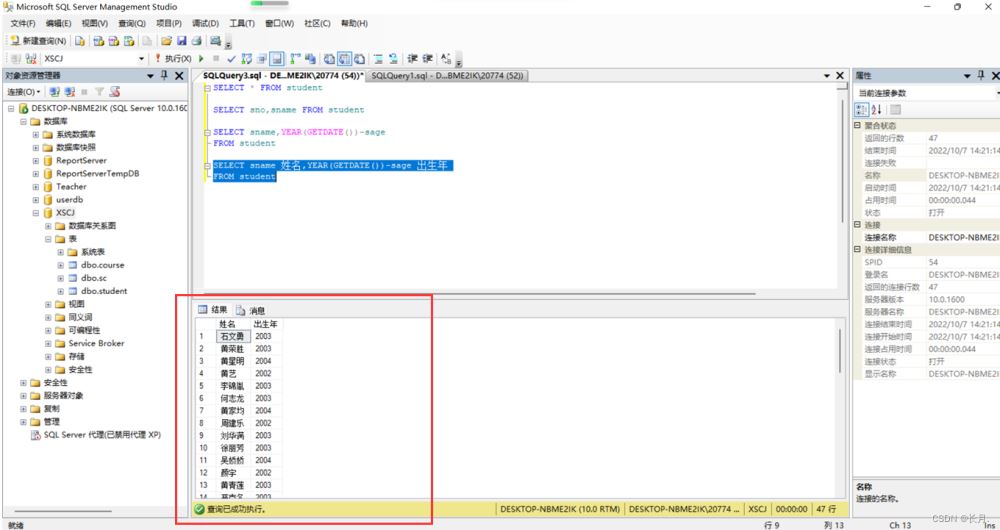 SELECT sname 姓名,YEAR(GETDATE())-sage 出生年FROM student