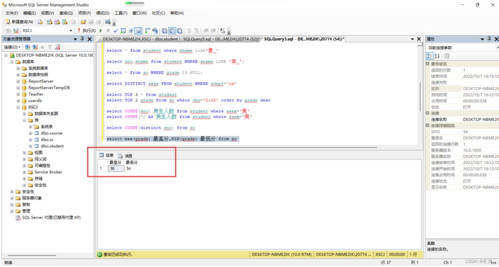 select max(grade) 最高分,MIN(grade) 最低分 from sc