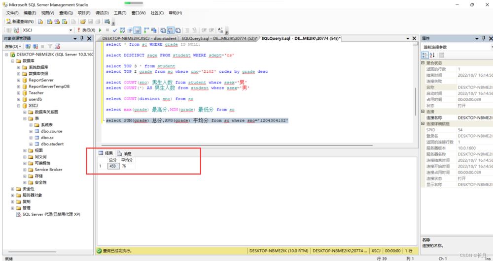 select SUM(grade) 總分,AVG(grade) 平均分 from sc where sno="1204304102"