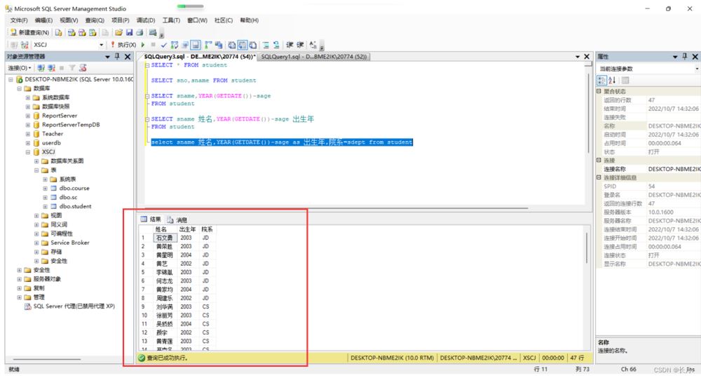select sname 姓名,YEAR(GETDATE())-sage as 出生年,院系=sdept from student