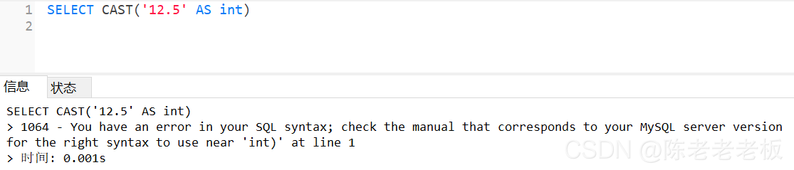 SELECT CAST("12.5" AS decimal)結(jié)果為 13注意:在這個數(shù)據(jù)庫版本會四舍五入,在其他版本可能不同,但用法相同