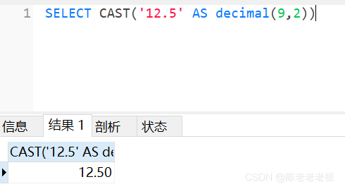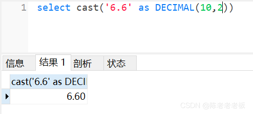 2.SELECT CAST("9.5" AS decimal(10,2))結(jié)果:9.50 注:(精度與小數(shù)位數(shù)分別為10與2。精度是總的數(shù)字位數(shù),包括小數(shù)點左邊和右邊位數(shù)的總和。而小數(shù)位數(shù)是小數(shù)點右邊的位數(shù))