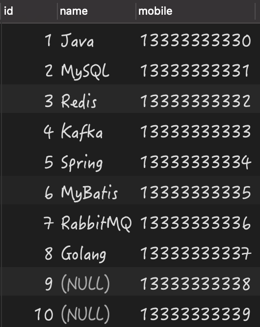 -- 如果存在 person 表先刪除DROP TABLE IF EXISTS person; -- 創建 person 表,其中 username 字段可為空,并為其設置普通索引CREATE TABLE person ( id INT PRIMARY KEY auto_increment, name VARCHAR(20), mobile VARCHAR(13), index(name)) ENGINE="innodb";-- person 表添加測試數據insert into person(name,mobile) values("Java","13333333330"), ("MySQL","13333333331"), ("Redis","13333333332"), ("Kafka","13333333333"), ("Spring","13333333334"), ("MyBatis","13333333335"), ("RabbitMQ","13333333336"), ("Golang","13333333337"), (NULL,"13333333338"), (NULL,"13333333339");select * from person;構建的測試數據,如下圖所示: