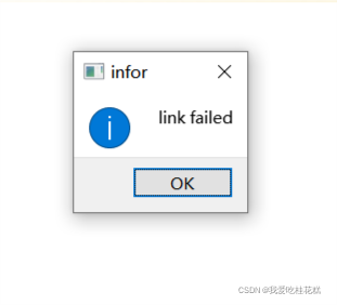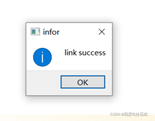 QSqlDatabase db = QSqlDatabase::addDatabase("QMYSQL"); db.setHostName("127.0.0.1"); //連接本地主機 db.setPort(3306); db.setDatabaseName("數據庫名"); db.setUserName("用戶名"); db.setPassword("密碼"); bool ok = db.open(); if (ok){QMessageBox::information(this, "infor", "link success"); } else {QMessageBox::information(this, "infor", "link failed");qDebug()<<"error open database because"<<db.lastError().text(); } 運行代碼,如果連接Mysql成功則輸出下面結果: