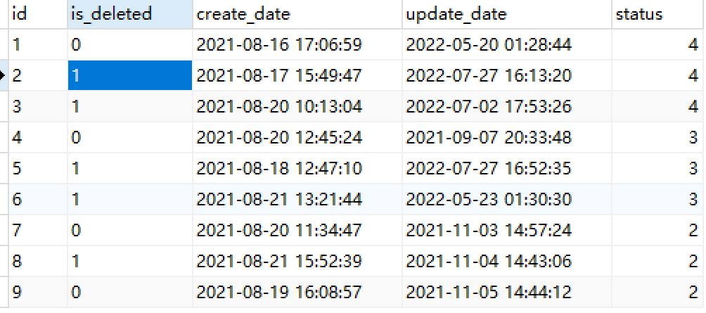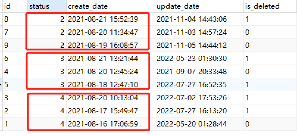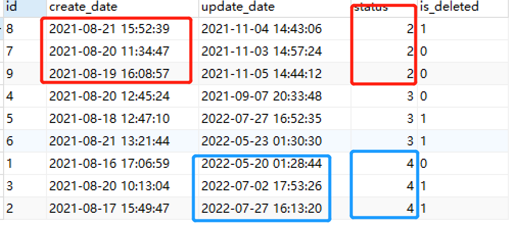 當(dāng)status=2時(shí)根據(jù)create_date降序,當(dāng)status=4時(shí)根據(jù)update_date升序。從結(jié)果中也可以看到達(dá)到了我們想要的效果。