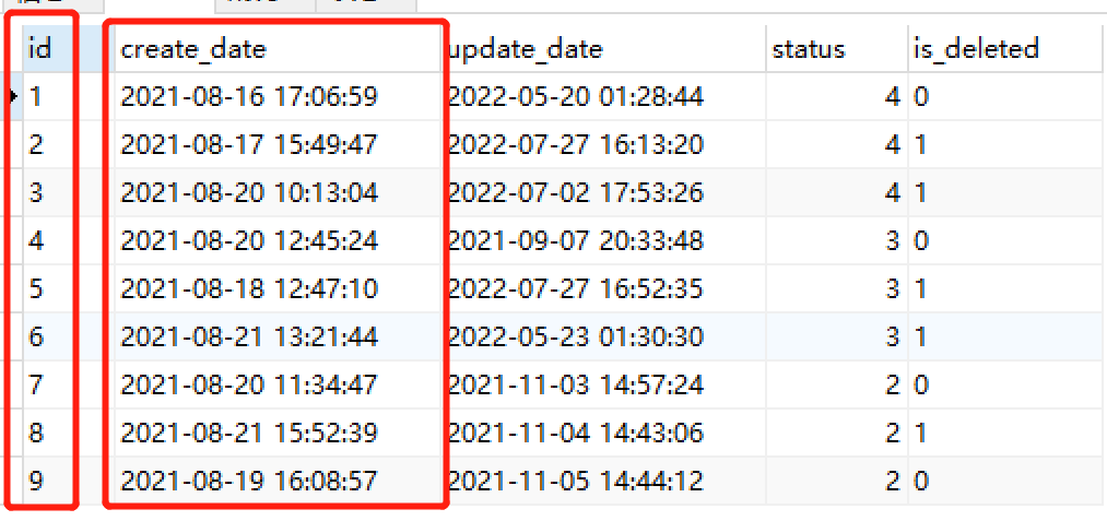 列2的SQL中我們把id字段排序換成了status字段排序,由于status字段的值是重復(fù)的,從結(jié)果中我們可以看到在status字段排序完成之后,create_date字段的排序就起作用了,就按照我們指定的DESC進(jìn)行排序了。