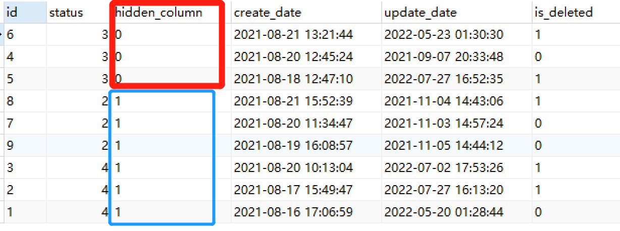 就是對(duì)hidden_column進(jìn)行排序之后,再對(duì)status進(jìn)行升序排序,接著再對(duì)create_date降序排序,結(jié)果也是一樣的。