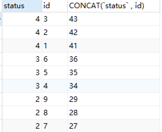 SELECT `status` , id ,CONCAT(`status` , id) FROM ordersORDER BY CONCAT(`status`, id) DESC
