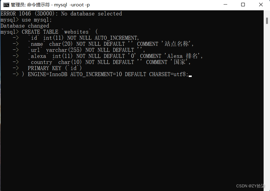 CREATE TABLE `websites` ( `id` int(11) NOT NULL AUTO_INCREMENT, `name` char(20) NOT NULL DEFAULT "" COMMENT "站點名稱", `url` varchar(255) NOT NULL DEFAULT "", `alexa` int(11) NOT NULL DEFAULT "0" COMMENT "Alexa 排名", `country` char(10) NOT NULL DEFAULT "" COMMENT "國家", PRIMARY KEY (`id`)) ENGINE=InnoDB AUTO_INCREMENT=10 DEFAULT CHARSET=utf8;