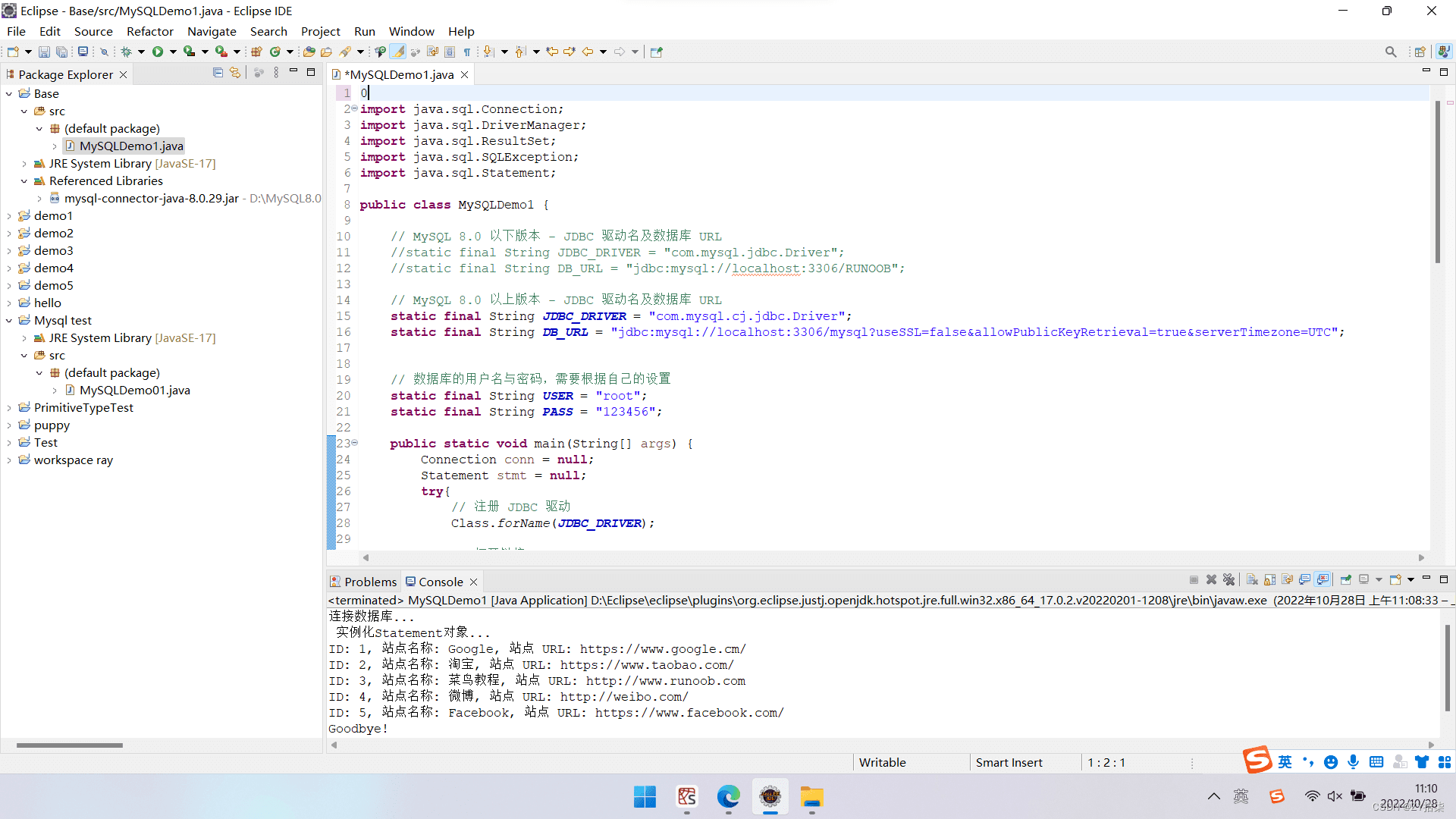 import java.sql.*; public class MySQLDemo { // MySQL 8.0 以下版本 - JDBC 驅動名及數據庫 URL //static final String JDBC_DRIVER = "com.mysql.jdbc.Driver"; //static final String DB_URL = "jdbc:mysql://localhost:3306/RUNOOB"; // MySQL 8.0 以上版本 - JDBC 驅動名及數據庫 URL static final String JDBC_DRIVER = "com.mysql.cj.jdbc.Driver"; static final String DB_URL = "jdbc:mysql://localhost:3306/RUNOOB?useSSL=false&allowPublicKeyRetrieval=true&serverTimezone=UTC";//這里為自己表所在的數據庫名稱 // 數據庫的用戶名與密碼,需要根據自己的設置 static final String USER = "root"; static final String PASS = "000000"; public static void main(String[] args) {Connection conn = null;Statement stmt = null;try{ // 注冊 JDBC 驅動 Class.forName(JDBC_DRIVER); // 打開鏈接 System.out.println("連接數據庫..."); conn = DriverManager.getConnection(DB_URL,USER,PASS); // 執行查詢 System.out.println(" 實例化Statement對象..."); stmt = conn.createStatement(); String sql; sql = "SELECT id, name, url FROM websites"; ResultSet rs = stmt.executeQuery(sql); // 展開結果集數據庫 while(rs.next()){// 通過字段檢索int id = rs.getInt("id");String name = rs.getString("name");String url = rs.getString("url"); // 輸出數據System.out.print("ID: " + id);System.out.print(", 站點名稱: " + name);System.out.print(", 站點 URL: " + url);System.out.print("\n"); } // 完成后關閉 rs.close(); stmt.close(); conn.close();}catch(SQLException se){ // 處理 JDBC 錯誤 se.printStackTrace();}catch(Exception e){ // 處理 Class.forName 錯誤 e.printStackTrace();}finally{ // 關閉資源 try{if(stmt!=null) stmt.close(); }catch(SQLException se2){ }// 什么都不做 try{if(conn!=null) conn.close(); }catch(SQLException se){se.printStackTrace(); }}System.out.println("Goodbye!"); }}驗證:成功實現eclipse與數據庫的連接