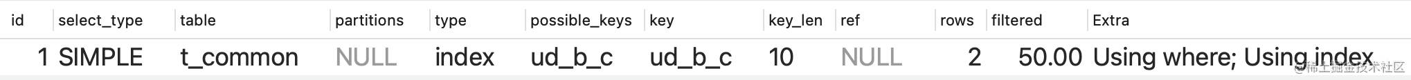 CREATE TABLE `t_common` ( `a` int unsigned NOT NULL AUTO_INCREMENT, `b` int DEFAULT NULL, `c` int DEFAULT NULL, `d` int DEFAULT NULL, PRIMARY KEY (`a`), KEY `ud_b_c` (`b`,`c`)) ENGINE=InnoDB AUTO_INCREMENT=3 DEFAULT CHARSET=utf8mb3;