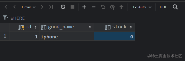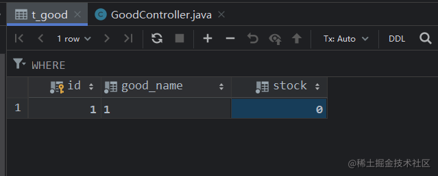 <update id="descGoodStock"> update t_desc.t_good set t_good.stock = t_good.stock - 1 where id = #{id}</update>考慮到 update 語句,若根據主鍵索引作為條件進行更新,會對數據庫的某一行加上行鎖(數據庫開啟事務自動提交),所以我們加上 stock > 0 的判斷條件