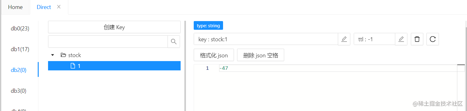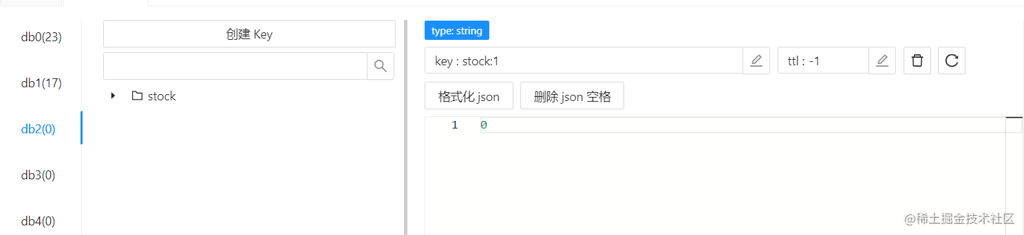 @PostMapping("/redis") public Map<String, Object> goodDescControllerByRedis(Long id) throws InterruptedException {HashMap<String, Object> ret = new HashMap<>();ret.put("info", "fail, 扣減失敗");// 查詢 Redis 中的庫存Integer stock = (Integer) redisTemplate.opsForValue().get(key + id);Thread.sleep(100);if (stock <= 0) { return ret;}// 扣減 redis 中庫存Long decrement = redisTemplate.opsForValue().decrement(key + id);if (decrement >= 0) { // 扣減數據庫庫存 goodMapper.descGoodStock(id); ret.put("info", "success, 扣減成功");}return ret; }其實 decrement 方法是原子性的,可以不用對庫存先進行查詢的操作,只需要判斷扣減后的數是否大于 0 即可。但是如果并發量高的話,建議還是加上判斷的邏輯,可以提高 Redis 的性能,不用每次進行 decrement 操作;