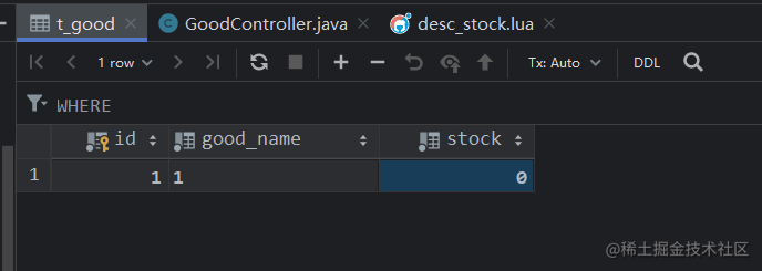 private static final DefaultRedisScript<Long> DECREASE_GOOD_STOCK_SCRIPT = new DefaultRedisScript<>();static { DECREASE_GOOD_STOCK_SCRIPT.setLocation(new ClassPathResource("/lua/desc_stock.lua")); // 設置返回值類型 DECREASE_GOOD_STOCK_SCRIPT.setResultType(Long.class);}@PostMapping("/lua")public Map<String, Object> goodDescControllerByLUA(Long id) { List<String> keys = new ArrayList<>(); keys.add("stock:" + id); HashMap<String, Object> ret = new HashMap<>(); ret.put("info", "fail, 扣減失敗"); Long execute = redisTemplate.execute(DECREASE_GOOD_STOCK_SCRIPT, keys); if (execute == 1) {goodMapper.descGoodStock(id);ret.put("info", "success, 扣減成功"); } return ret;}結果:Redis 和 MySQL 中的庫存均為 0 ,沒有超賣