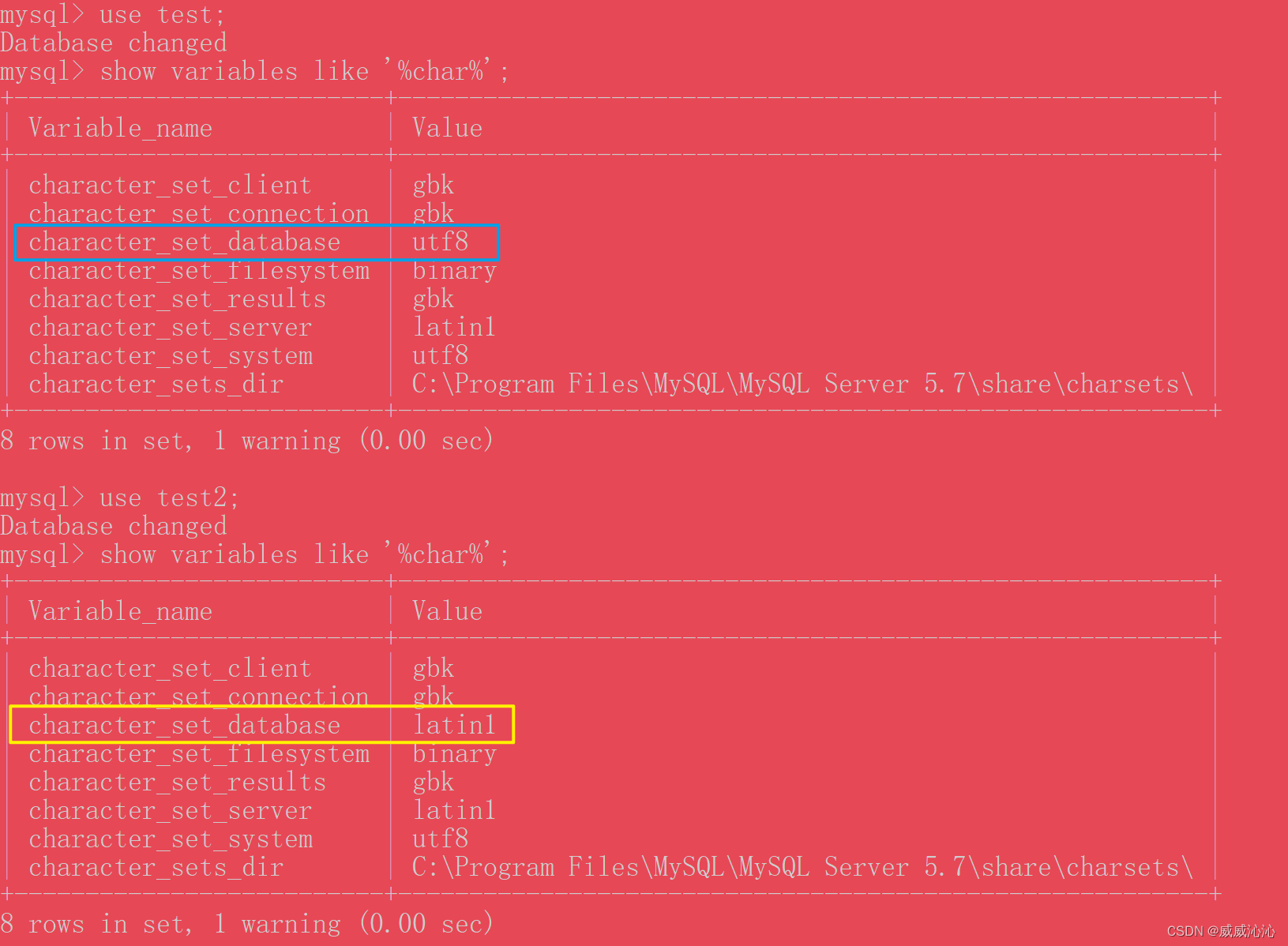 我們再查看該數據庫時,我們會發現我們設置數據庫字符集改變了,但是當我們使用其他數據庫時,其字符集還是 latinl。