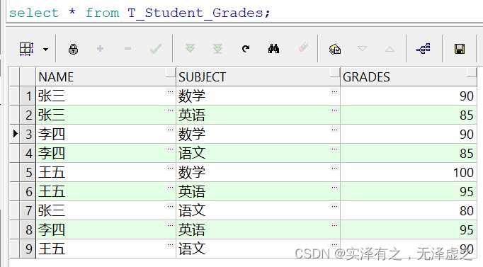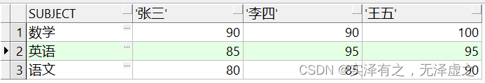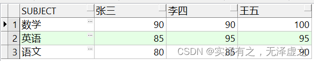 select * from T_Student_Gradespivot(avg(grades)for name in ("張三" as 張三,"李四" as 李四,"王五" as 王五))返回結(jié)果如下:按指定科目統(tǒng)計(jì)所有學(xué)生的平均成績(jī),并將學(xué)生姓名字段行轉(zhuǎn)列,顯示別名(此時(shí)雖然用到了聚合函數(shù)avg,由于SUBJECT字段也一并顯示,因此avg函數(shù)并沒(méi)有起到效果,顯示依舊是每一個(gè)學(xué)生的各科具體成績(jī))。