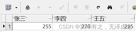 select * from (select name,grades from T_Student_Grades)pivot(sum(grades)for name in ("張三","李四","王五"))返回結(jié)果如下:統(tǒng)計(jì)每一個(gè)學(xué)生的所有科目總成績(jī),并將學(xué)生姓名字段行轉(zhuǎn)列(SUBJECT字段沒(méi)有顯示)。