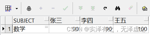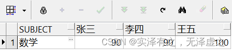 select * from T_Student_Gradespivot(max(grades)for name in ("張三" as 張三,"李四" as 李四,"王五" as 王五))where subject="數(shù)學(xué)"返回結(jié)果如下:按指定科目統(tǒng)計(jì)所有學(xué)生的最高成績(jī),并將學(xué)生姓名字段行轉(zhuǎn)列,并且只顯示數(shù)學(xué)這一科目的成績(jī)(此時(shí)雖然用到了聚合函數(shù)max,由于SUBJECT字段也一并顯示,因此max函數(shù)并沒(méi)有起到效果,依舊是顯示每一個(gè)學(xué)生的各科具體成績(jī))。