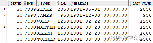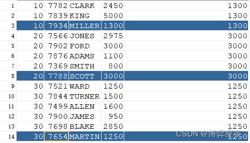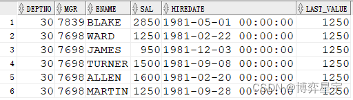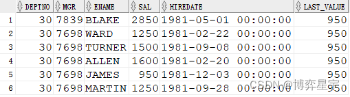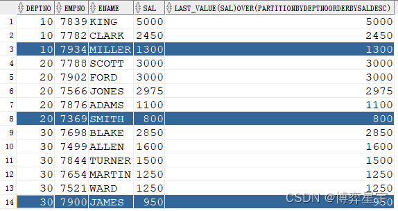 last_value(sal) 的結果與 order by sal 排序有關。如果排序為order by sal desc, 則最終的結果為分組排序后sal的最小值(分組排序后的最后一個值), 當deptno為10時,max_sal為1300。