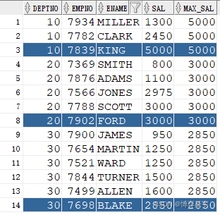 SELECT DEPTNO, EMPNO, ENAME, SAL,last_value(SAL) OVER(PARTITION BY DEPTNO ORDER BY SAL ROWS BETWEEN UNBOUNDED PRECEDING AND CURRENT ROW) MAX_SAL FROM EMP;