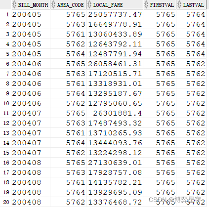 思路:先進行group by bill_month, area_code使用聚合函數sum()求解出by bill_month, area_code的local_fare總和, 即sum(local_fare), 然后再運用分析函數進行求解每個月通話費用最高和最低的兩個地區。