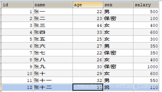 實(shí)例建表 user表CREATE TABLE `user` ( `id` int(11) NOT NULL AUTO_INCREMENT, `name` varchar(20) COLLATE utf8_unicode_ci DEFAULT NULL, `number` int(11) DEFAULT NULL, `sex` varchar(4) COLLATE utf8_unicode_ci DEFAULT NULL, `salary` int(11) DEFAULT NULL, PRIMARY KEY (`id`)) ENGINE=InnoDB AUTO_INCREMENT=13 DEFAULT CHARSET=utf8 COLLATE=utf8_unicode_ci