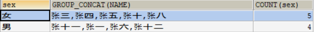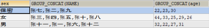 SELECT sex ,GROUP_CONCAT(NAME), GROUP_CONCAT(age)FROM USER GROUP BY sex;