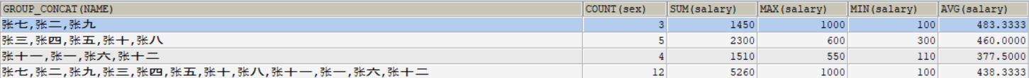 SELECT sex ,GROUP_CONCAT(NAME),COUNT(sex),SUM(salary),MAX(salary),MIN(salary),AVG(salary) FROM USER GROUP BY sex WITH ROLLUP;