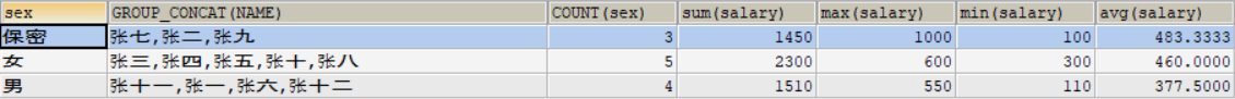 SELECT sex ,GROUP_CONCAT(NAME),COUNT(sex),SUM(salary),MAX(salary),MIN(salary),AVG(salary) FROM USER GROUP BY sex;