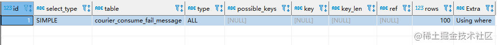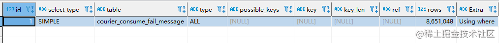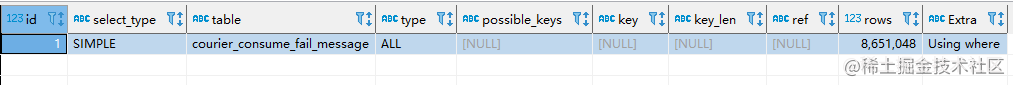 在我們的生產環境中有一張表:courier_consume_fail_message,是存放消息消費失敗的數據的,設計之初,這張表的數據量評估在萬級別以下,因此沒有建立索引。