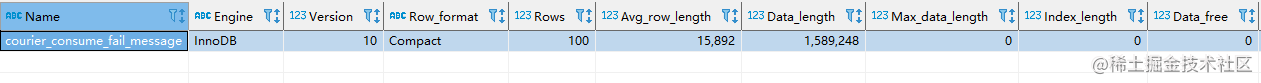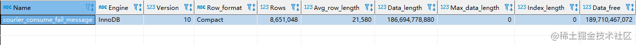 三、清理碎片下面是執行 OPTIMIZE TABLE courier_consume_fail_message; 后的統計。