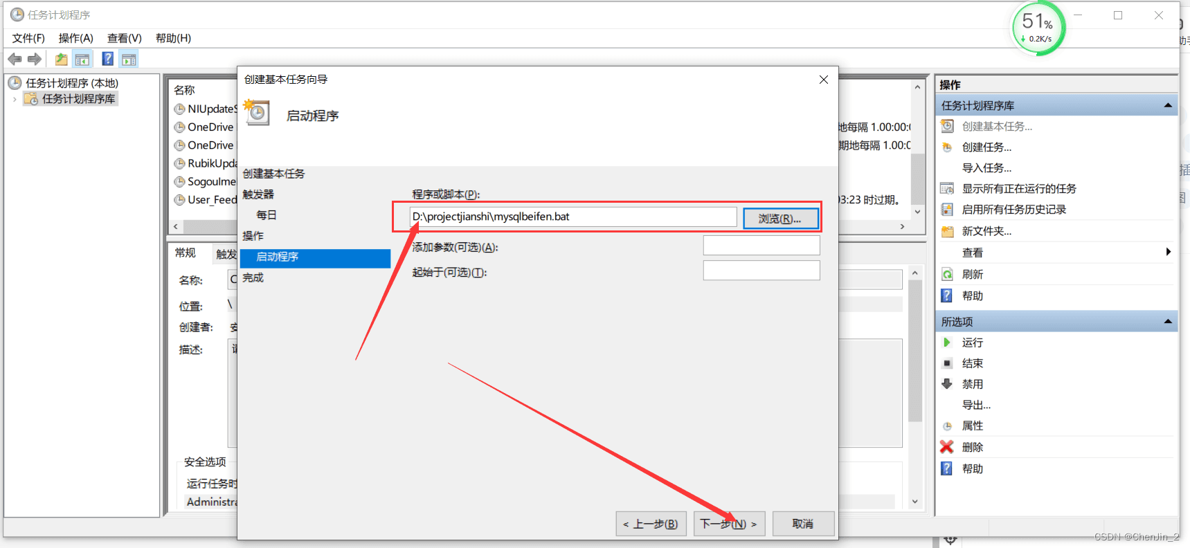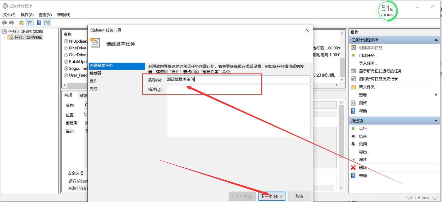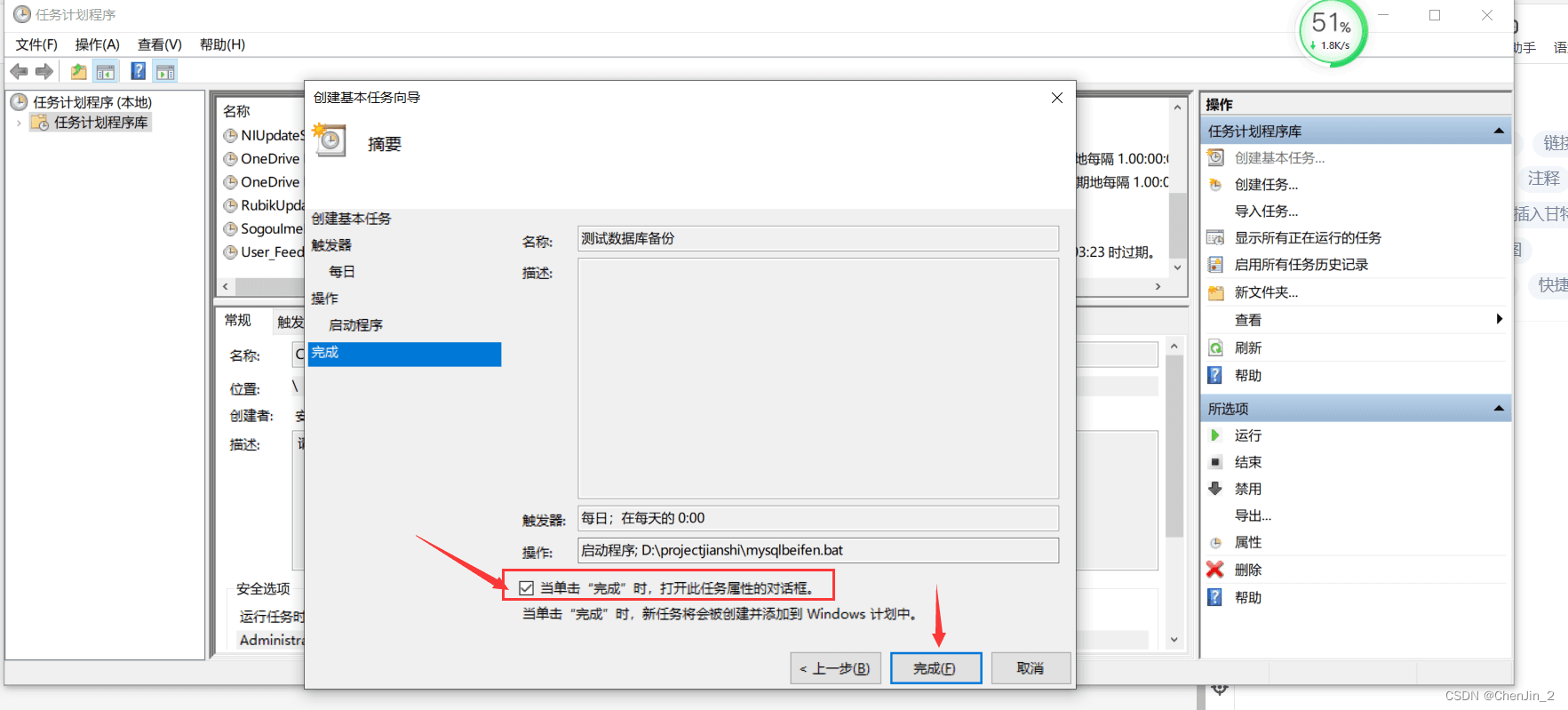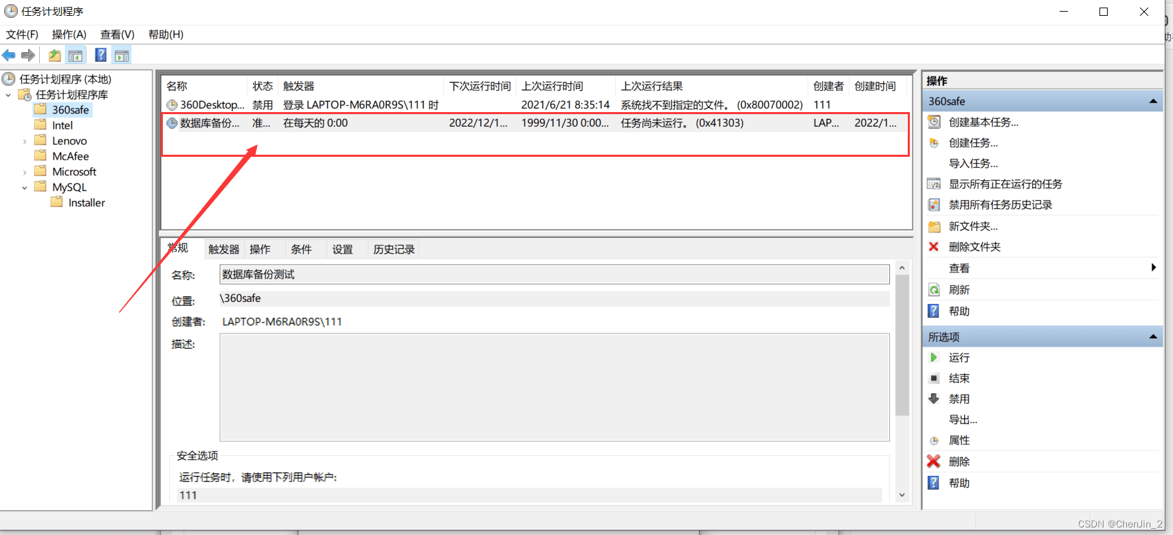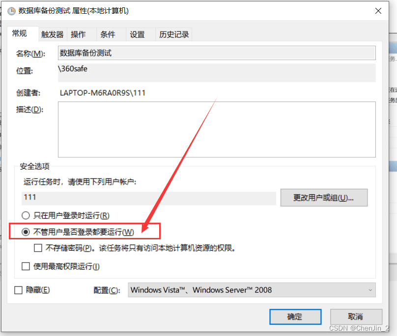 目錄1、編寫腳本xxx.bat2、實現定時任務2.1、打開任務計劃程序2.2、創建基本任務2.3、輸入名稱 點擊下一步2.4、設置觸發器 點擊下一步2.4、設置執行時間 點擊下一步2.5、設置自動程序 點擊下一步2.6、選擇腳本所在位置 點擊下一步2.7、點擊完成2.8、設置安全選項2.9、點擊確定輸入自己電腦密碼再次點擊確定。2.10、任務設置成功總結1、編寫腳本xxx.bat@echo offecho 設置MySql數據庫的連接信息set host=127.0.0.1set port=3306set user=rootset pass=123456echo 設置要備份MySql數據庫名稱set dbname=projectmonitoringecho 獲取當天的日期格式,例如:2022-12-13-14-30-40set backup_date=%date:~0,4%-%date:~5,2%-%date:~8,2%-%time:~0,2%-%time:~3,2%-%time:~6,2%echo 設置備份文件的路徑set backupfile=D:\projectjianshi\sql\mysql\%dbname%-%backup_date%.sqlecho 使用mysqldump對指定的MySql進行備份echo 注意路徑中有空格的要加上雙引號'C:\Program Files\MySQL\MySQL Server 5.7\bin\mysqldump' -h%host% -P%port% -u%user% -p%pass% -c --add-drop-table %dbname% > %backupfile%echo 刪除過期文件,這里是超過30天就刪除forfiles /p D:\projectjianshi\sql\mysql\ /s /m *.sql /d -30 /c 'cmd /c del @file /f'exist2、實現定時任務2.1、打開任務計劃程序