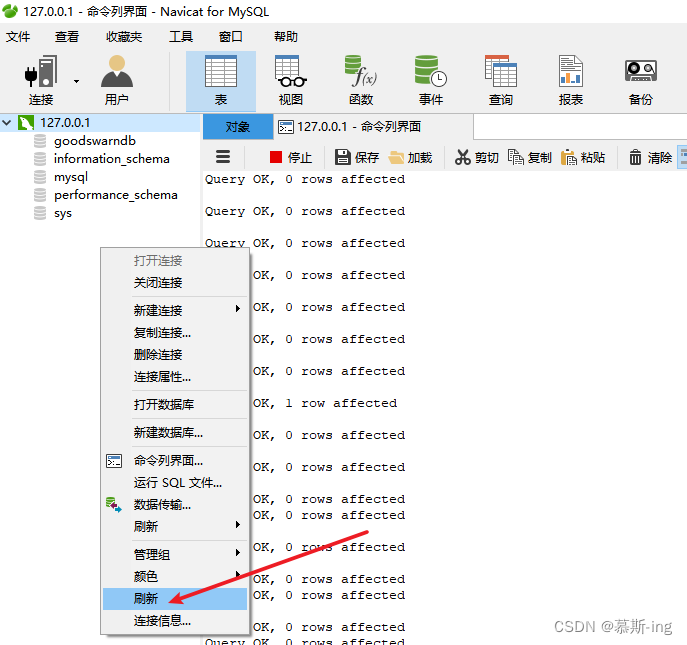4、刷新,否則無法看到新增的數據庫、數據表、數據表中的記錄