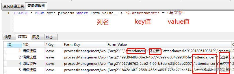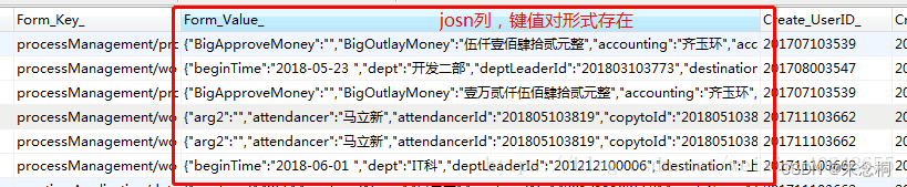 舉個栗子1、首先我們看到數據表中,Form_Value_一列是josn格式存在的,又想通過其中的一組或者幾組鍵值對來進行查詢。