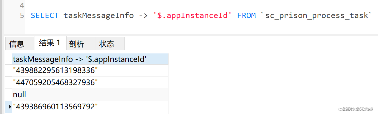 1、使用 字段 -> ‘$.json’ 屬性’ 進行查詢條件