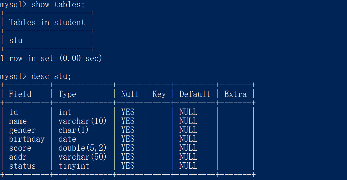 show tables;查詢表結構: