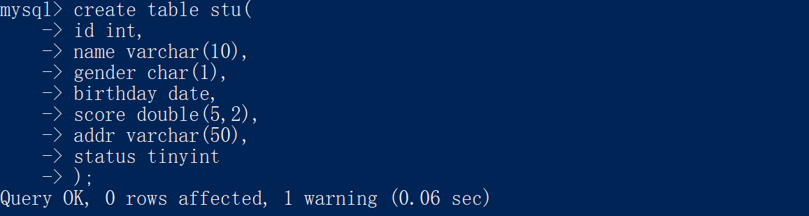 create table 表名稱(字段名1 數據類型,字段名2 數據類型,...字段名n 數據類型 #這里是不需要加上,的);小案例: