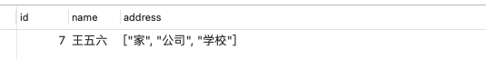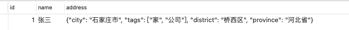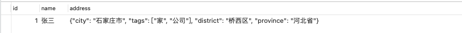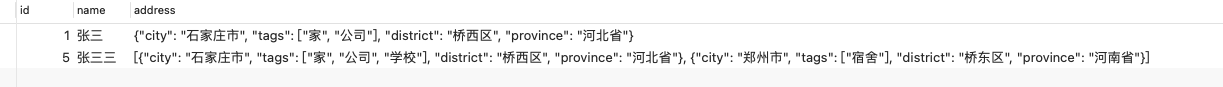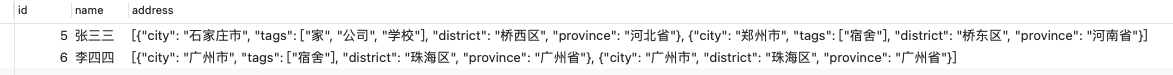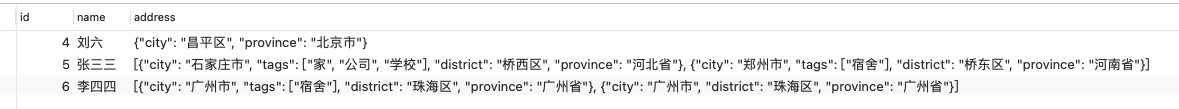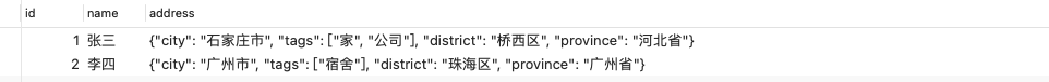 CREATE TABLE `users` ( `id` int unsigned NOT NULL AUTO_INCREMENT, `name` varchar(255) NOT NULL COMMENT '姓名', `address` json NOT NULL COMMENT '住址', PRIMARY KEY (`id`)) ENGINE=InnoDB DEFAULT CHARSET=utf8;插入幾條數據
