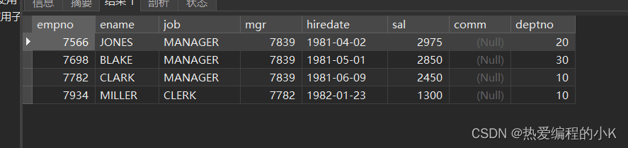 SELECT * FROM emp WHERE (job,mgr)=(SELECT job,mgr FROM emp WHERE empno=7566)AND emp<>7566;?效果如下: