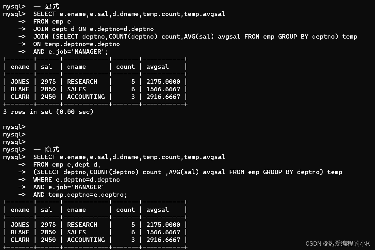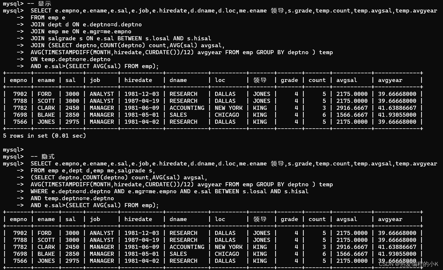 #隱式方式SELECT e.empno,e.ename,e.sal,e.job,e.hiredate,d.dname,d.loc,me.ename 領導,s.grade,temp.count,temp.avgsal,temp.avgyearFROM emp e,dept d,emp me,salgrade s,(SELECT deptno,COUNT(deptno) count,AVG(sal) avgsal,AVG(TIMESTAMPDIFF(MONTH,hiredate,CURDATE())/12) avgyear FROM emp GROUP BY deptno) temp WHERE e.deptno=d.deptno AND e.sal>(SELECT AVG(sal) FROM emp)AND e.mgr=me.empnoAND e.sal BETWEEN s.losal AND s.hisalAND temp.deptno=e.deptno;#顯示方式SELECT e.empno,e.ename,e.sal,e.job,e.hiredate,d.dname,d.loc,me.ename 領導,s.grade,temp.count,temp.avgsal,temp.avgyearFROM emp e JOIN dept d ON e.deptno=d.deptno AND e.sal>(SELECT AVG(sal) FROM emp)LEFT JOIN emp me ON e.mgr=me.empnoJOIN salgrade s ON e.sal BETWEEN s.losal AND s.hisalJOIN (SELECT deptno,COUNT(deptno) count,AVG(sal) avgsal,AVG(TIMESTAMPDIFF(MONTH,hiredate,CURDATE())/12) avgyear FROM emp GROUP BY deptno) temp ON temp.deptno=e.deptno;