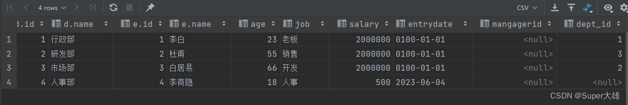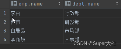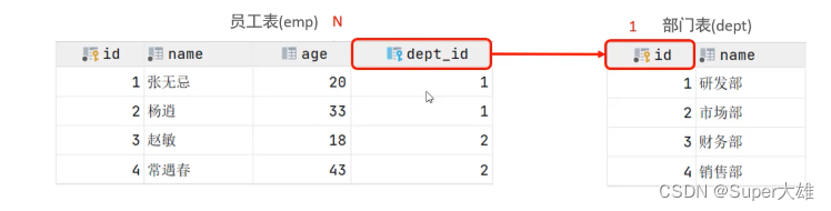 create table dept( id int auto_increment comment 'id'primary key, name varchar(50) not null comment '部門(mén)名稱(chēng)') comment '部門(mén)表'; create table emp( id int auto_increment comment 'id'primary key, name varchar(50) not null comment '姓名', ageint null comment '年齡', jobvarchar(20) null comment '職位', salary int null comment '薪水', entrydate datenull comment '入職時(shí)間', mangagerid int null comment '直屬的領(lǐng)導(dǎo)id', dept_id int null comment '部門(mén)id', constraint dept_idforeign key (dept_id) references dept (id)) comment '員工表';兩張表消除笛卡爾積的方法:emp.dept_id=dept.id