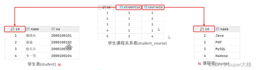 案例: 學(xué)生與 課程的關(guān)系關(guān)系:一個(gè)學(xué)生可以選修多門(mén)課程,一門(mén)課程也可以供多個(gè)學(xué)生選擇實(shí)現(xiàn): 建立第三張中間表,中間表至少包含兩個(gè)外鍵,分別關(guān)聯(lián)兩方主鍵