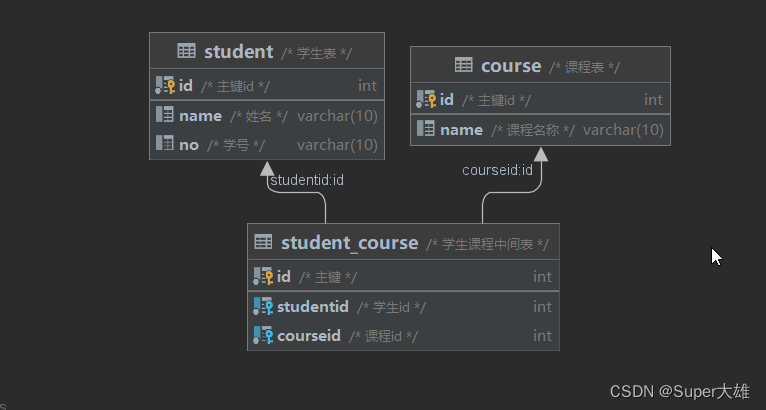 create table student_course( idint auto_increment comment '主鍵'primary key, studentid int not null comment '學(xué)生id', courseid int not null comment '課程id', constraint f_kcourseidforeign key (courseid) references course (id), constraint f_kstudentidforeign key (studentid) references student (id)) comment '學(xué)生課程中間表';