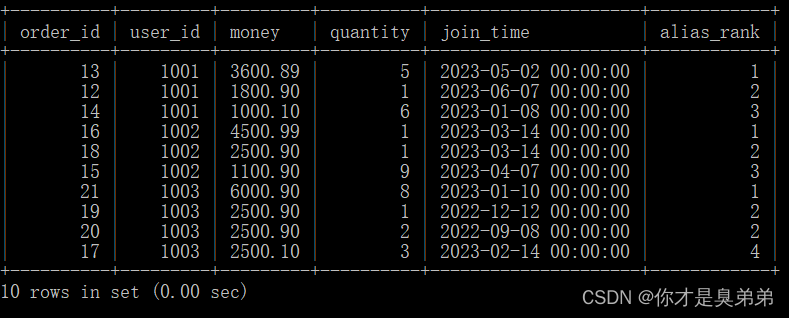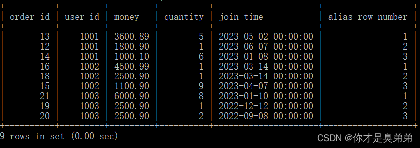 select *from (select *,row_number() over(partition by user_id order by money desc) as alias_row_numberfrom order_for_goods) twhere alias_row_number<=3;以上SQL語句使用了窗口函數 row_number() 來為每個分區內的行分配序號。然后,外部查詢從這些序號中選擇前三個最高的行。內部查詢從 order_for_goods 表中選擇了所有的列,并使用 row_number() 函數為每個分區內的行分配序號。在這個例子中,子查詢將數據是按照 user_id 列進行分區 ,按照 money 列的降序排列的。外部查詢從內部查詢的結果中選擇了序號小于等于 3 的行,這些行對應于分區內前三高的行。2、執行結果